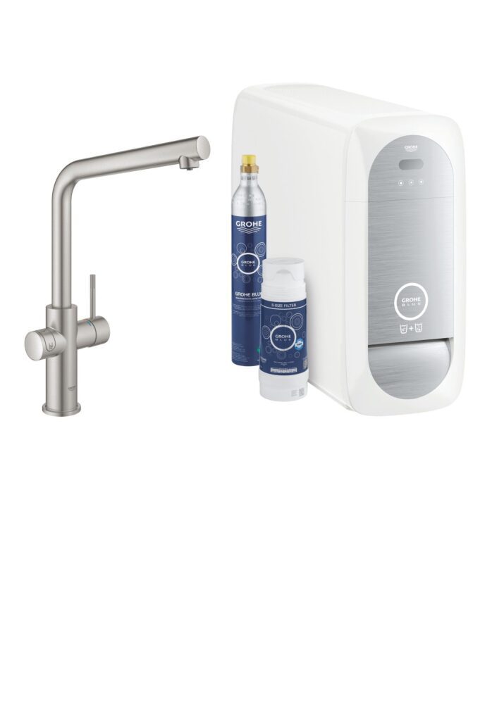 - Komplekte rasite GROHE Blue vienasvirtį maišytuvą, energiją taupančią šaldymo sistemą, filtrą CO2 butelį, kuris skirtas gazuotam vandeniui. Šaldymo sistema pritaikoma kiekvienoje virtuvėje, jei tereikės 30 cm pločio erdvės, o tiek filtras tiek CO2 butelis yra talpinami jos viduje, bei yra labai paprastai išimami bei pakeičiami. Su Blue Home Duo taip pat gaunate puikų standartinį plautuvės maišytuvą su aukštu snapeliu bei 150° pasukimo diapazonu. Jo viduje yra atskiri kanalai filtruotam ir vandentiekio vandeniui. Svirtimi yra reguliuojamas vandentiekio vanduo, o filtruotam, atšaldytam bei gazuotam vandeniui tiesiog paspauskite LED apšviestą mygtuką. LED indikatoriai taip pat įspės kada reikia pakeisti CO2 talpą.