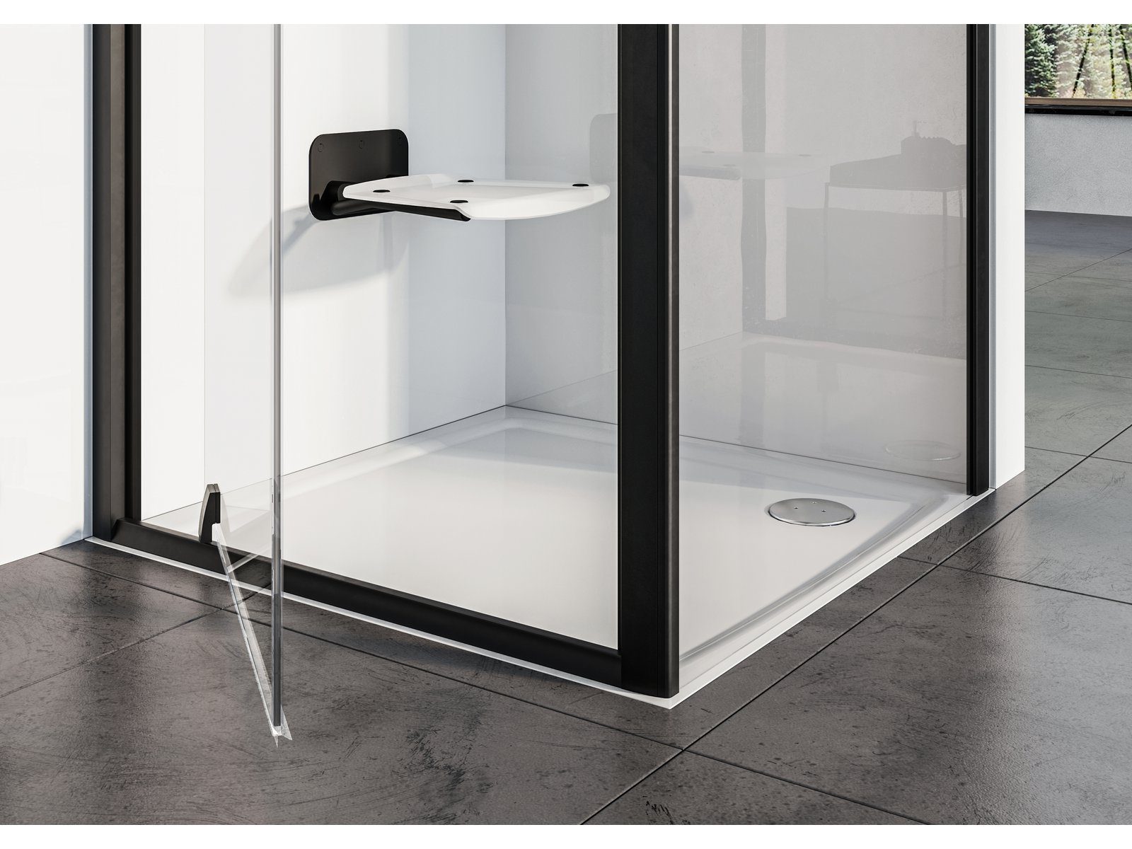 Dušo kabina Pivot su juodos spalvos rėmu ir skaidraus stiklo užpildu, padengtu apsauginiu sluoksniu Ravak AntiCalc®. Varstomos durys. Komplekte dušo durys ir dvi stacionarios sienelės. Gaminys tinkamas montuoti tiek dešininiam tiek kariniam įėjimo varinatui.
