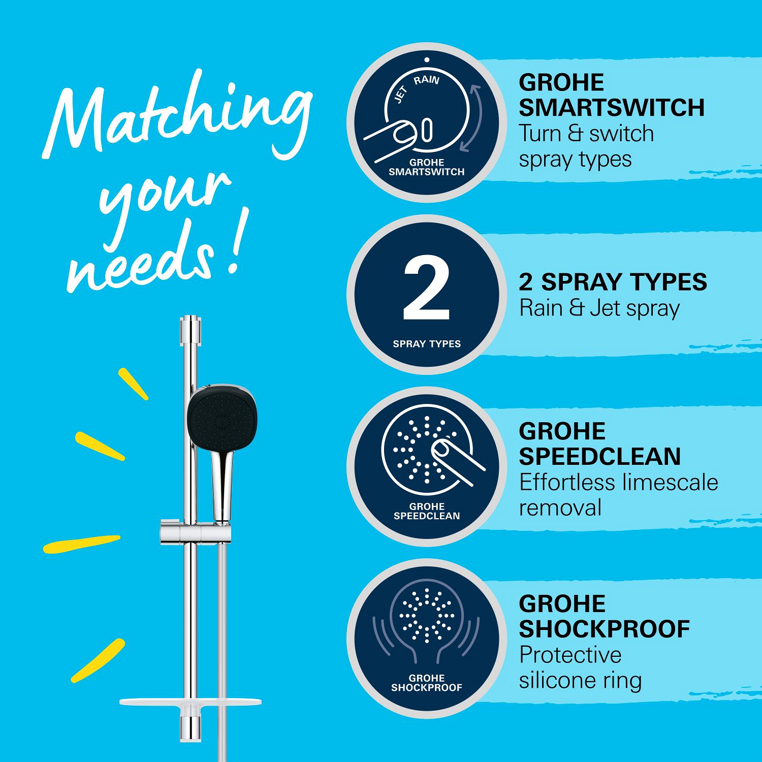 • Rankinis dušelis turi dvi sroves: vasarišką lietų primenančią ir maloniai atpalaiduojančią Rain bei galingą, puikiai šampūną skalaujančią Jet. Jas lengva reguliuoti, naudojant naujovišką GROHE SmartSwitch perjungėją, esantį dušo galvutės nugarinėje dalyje.