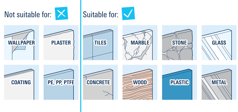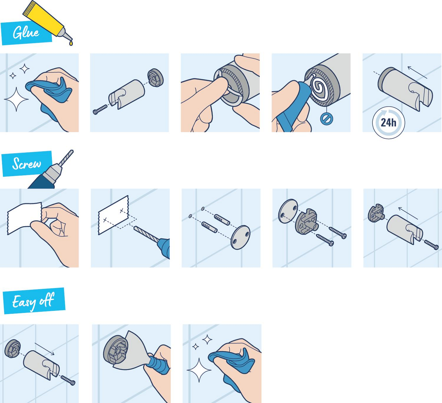 GROHE QuickFix – nepamirškite, kaip lengva jį montuoti! Dušo komplektą galima prisukti (varžtai ir kaiščiai yra komplekte) arba priklijuoti! Viskas, ko jums reikia, yra 2 vnt. klijų QuickGlue S 41247000 (parduodama atskirai).