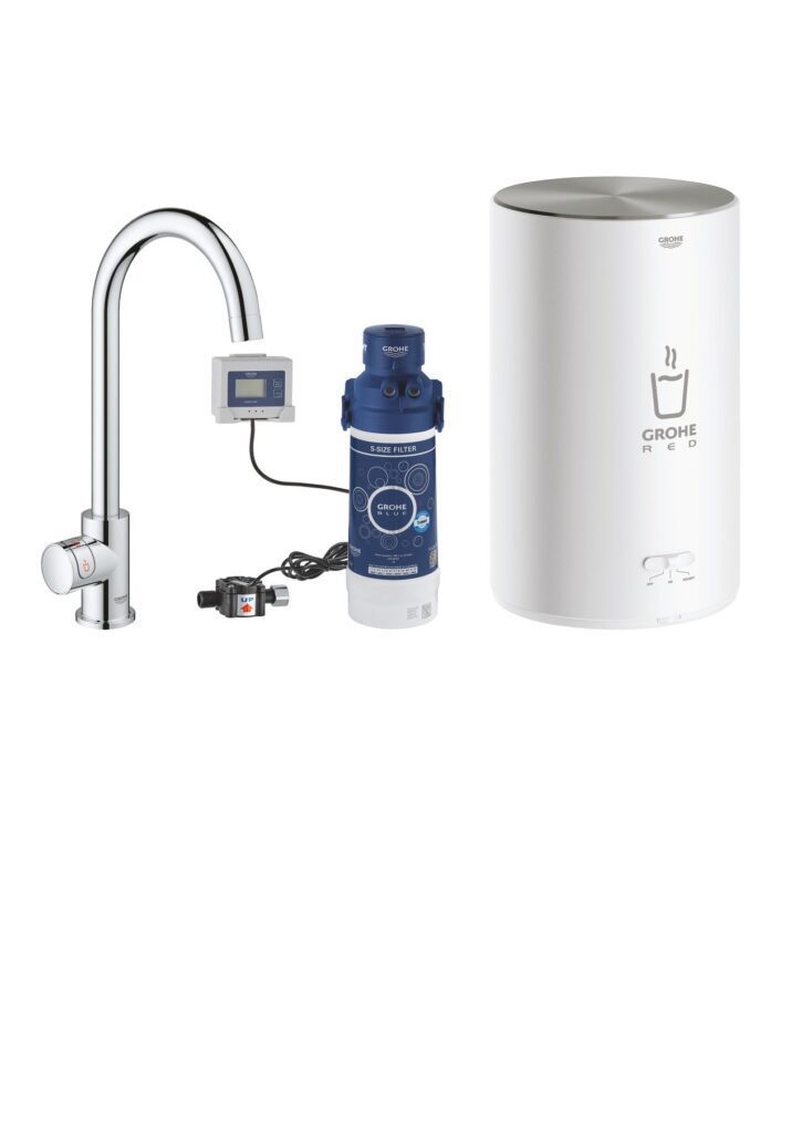 GROHE ChildLock mygtukai verdančiam vandeniui, TÜV sertifikuotos trigubos elektroninės apsaugos priemonės nuo atsitiktinio verdančio vandens įjungimo, GROHE Red katilo prijungimas, GROHE Raudonas katilas M dydis, verdančio ir karšto vandens rezervuaras, 3 litrai 100 ° C verdančio vandens, 4 litrų bendra talpa, reikalingas slėgis įleidimo angoje: 1-7 barai, su lanksčia jungties žarna ir išleidimo anga verdančiam vandeniui, CE patvirtintas, maitinimo šaltinis 230 V 50 Hz, energijos suvartojimas 2100 W, A energinio naudingumo klasė, GROHE Blue S dydžio filtrų rinkinys pradedantiesiems.