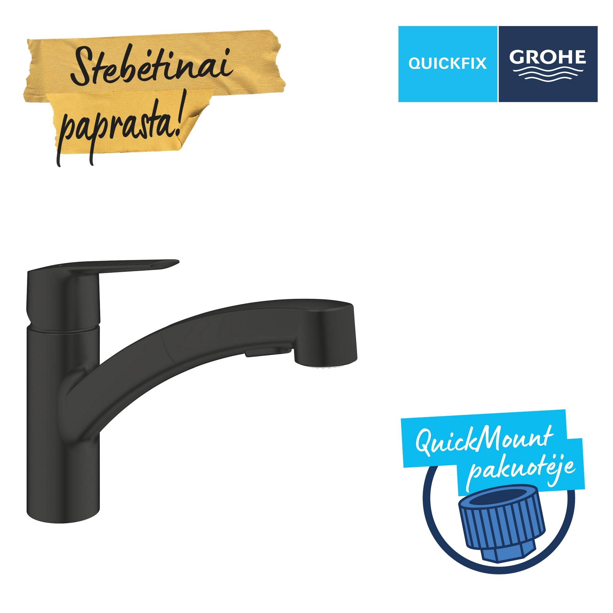 GROHE QuickFix leis šį maišytuvą sumontuoti stebėtinai paprastai patiems – net jeigu ir neturite jokios montavimo patirties! Pakuotėje rasite viską, ko reikia montavimui, ir pasitelkdami QuickMount, QuickGuide ir QuickVideo, maišytuvą sumontuosite be rūpesčių.