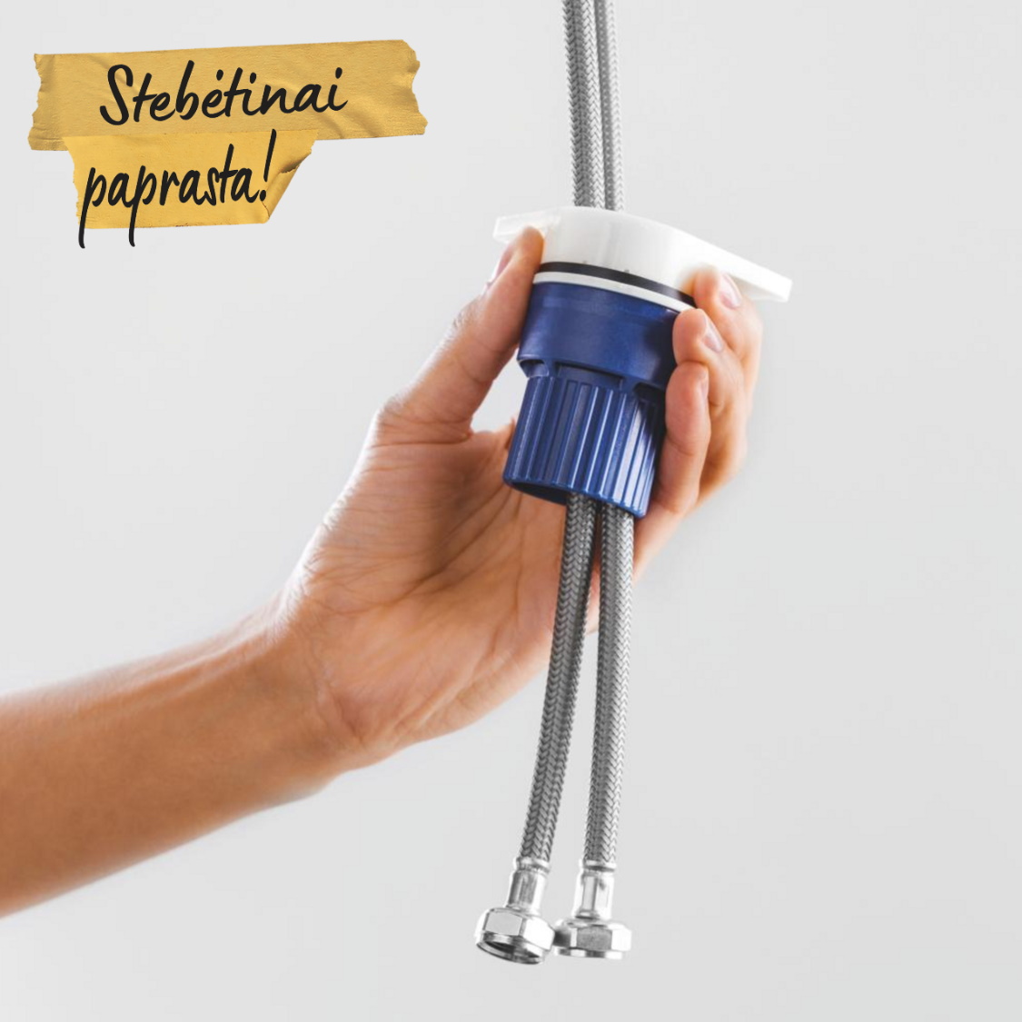 Tai maišytuvų pritvirtinimo sistema, kuriai nereikia įrankių.