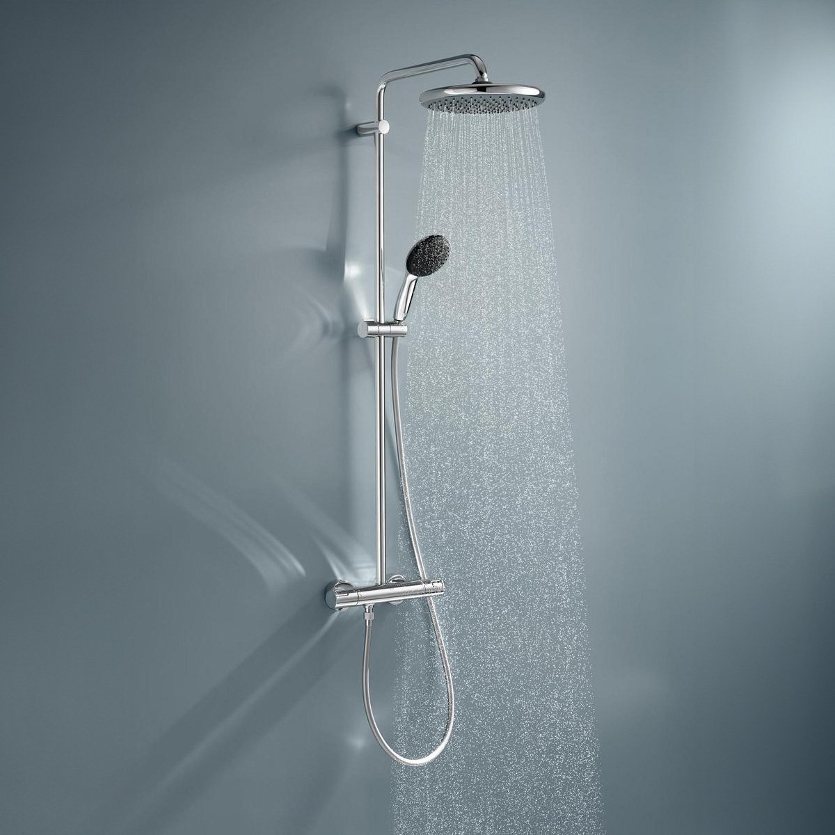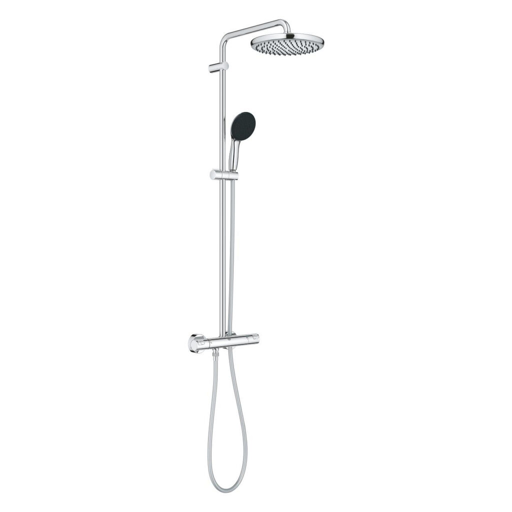 Naujoji GROHE Vitalio Comfort 250 dušo sistema su termostatiniu maišytuvu užtikrina išskirtinį maudymosi malonumą už neįtikėtinai patrauklią kainą. Tai puikus modernaus dizaino ir patogių funkcijų derinys. Termostatinis maišytuvas pasižymi technologijomis, kurios užtikrina pastovią vandens temperatūrą bei apsaugo nuo nusiplikymo, o 110mm pločio rankinis dušelis leidžia pagal nuotaiką rinktis iš dviejų klasikinių GROHE srovių.